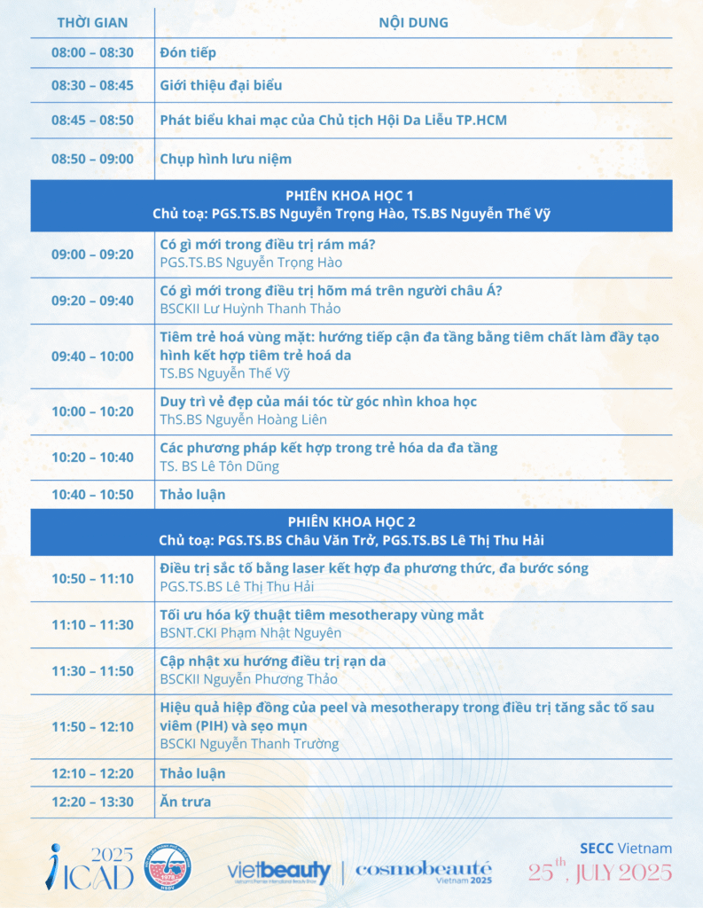 Hội Da Liễu TP. Hồ Chí Minh phối hợp cùng Ban Tổ chức Triển lãm Vietbeauty 2025 trân trọng thông báo tổ chức Phiên Hội thảo khoa học quốc tế “International Conference on Anti-Aging and Aesthetic Dermatology – ICAD” với chủ đề: